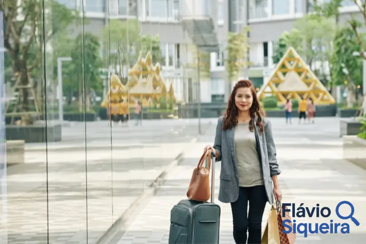Mulher caminhando com mala e bolsa, simbolizando a decisão de morar fora do Brasil.